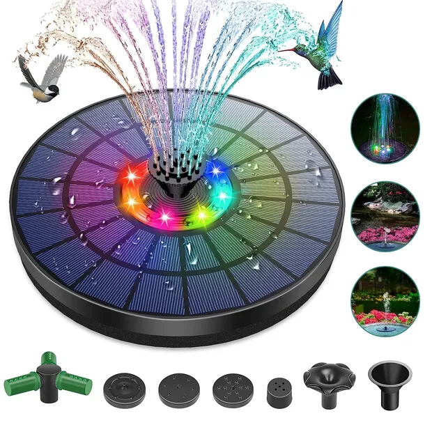 6 kolorowych diod LED: solarna pompa fontannowa ma wbudowany akumulator 1500 mAh i 6 diod LED, które magazynują energię elektryczną w bezpośrednim świetle słonecznym w ciągu dnia, które działa w nocy, automatycznie wykrywając intensywność światła w nocy za pomocą systemu wykrywania światła. Każda kolorowa dioda LED przełącza się losowo, aby wyświetlić kolorową i unikalną funkcję wody. Nadaje się do stawów dla ptaków, akwarium, małych stawów, basenów i dekoracji ogrodu.