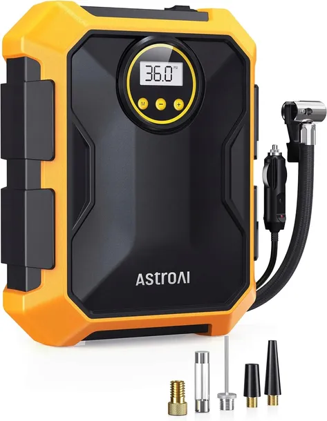 Wielofunkcyjne dysze - sprężarka powietrza 12 V jest wyposażona w 3 dysze i 1 dodatkowy bezpiecznik. Dołączone dysze pomagają sprężarce powietrza pompować szeroką gamę produktów, od opon do kompaktowych lub średnich limuzyn, SUV-ów, motocykli i motocykli, aż po sprzęt sportowy, taki jak pływaki, piłki i wiele innych.