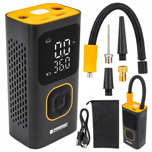 Kompresor samochodowy akumulatorowy Powermat to poręczne urządzenie z akumulatorem 4000 mAh i ciśnieniem do 10 bar, oferujące automatyczne wyłączanie, pięć trybów pracy, funkcję powerbanku, latarkę LED oraz zestaw końcówek – idealne do szybkiego pompowania opon, rowerów, piłek i materacy w każdej sytuacji.