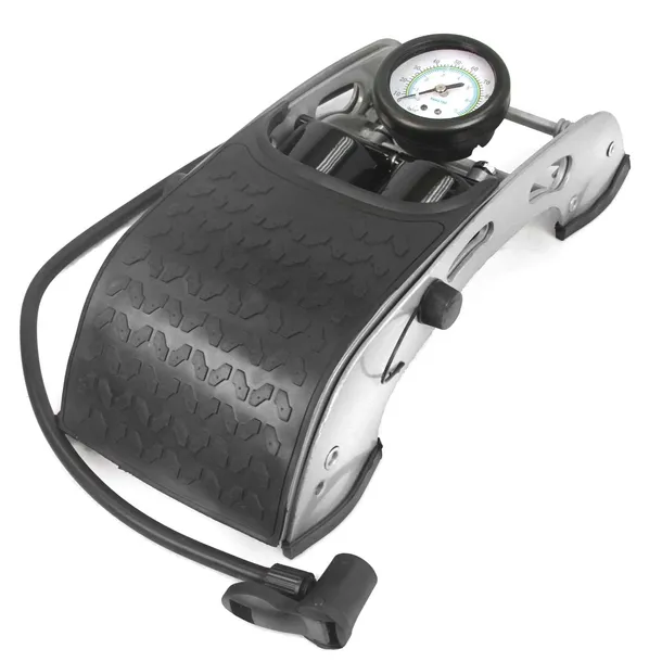 Podwójna pompka nożna z manometrem przeznaczona do pompowania samochodów, rowerów, sprzętu sportowego i turystycznego.