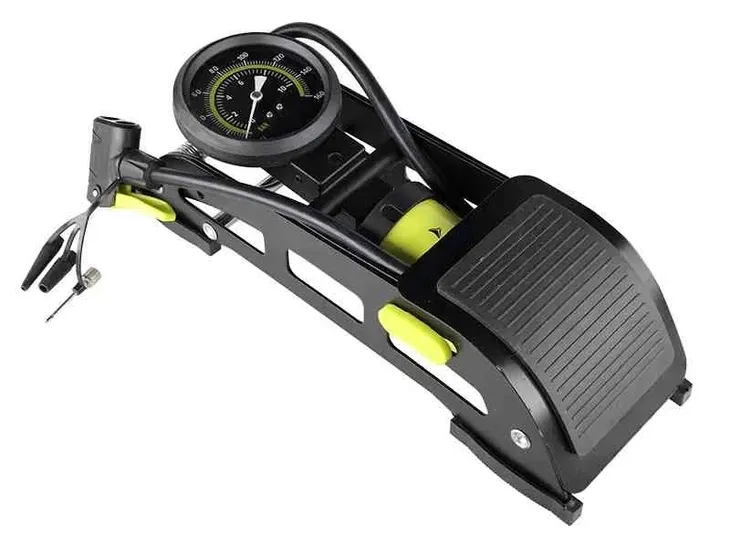 Pompka nożna jednotłokowa z ciśnieniomierzem analogowym wyskalowanym na 11 BAR (160 PSI). Wyposażona w wąż o długości 68cm z wielofunkcyjną końcówką. W zestawie są trzy adaptery do pompowania.