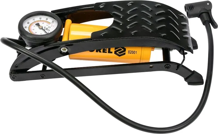 Pompka nożna jednotłokowa z manometrem. Wykonana z metalu, przewód elastyczny zakończony uniwersalną końcówką umożliwiającą pompowanie zarówno wentyli samochodowych jak i rowerowych. Manometr wyskalowany do 7 BAR. W zestawie znajdują się również uniwersalne końcówki do pompowania piłek, materacy itp.