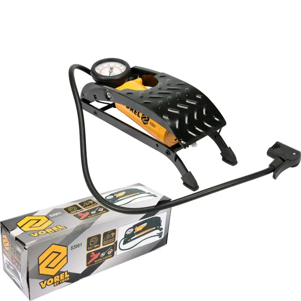 Pompka nożna jednotłokowa z manometrem. Wykonana z metalu, przewód elastyczny zakończony uniwersalną końcówką umożliwiającą pompowanie zarówno wentyli samochodowych jak i rowerowych. Manometr wyskalowany do 7 BAR. W zestawie znajdują się również uniwersalne końcówki do pompowania piłek, materacy itp.