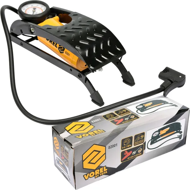 Pompka nożna jednotłokowa z manometrem. Wykonana z metalu, przewód elastyczny zakończony uniwersalną końcówką umożliwiającą pompowanie zarówno wentyli samochodowych jak i rowerowych. Manometr wyskalowany do 7 BAR. W zestawie znajdują się również uniwersalne końcówki do pompowania piłek, materacy itp.
