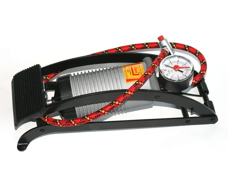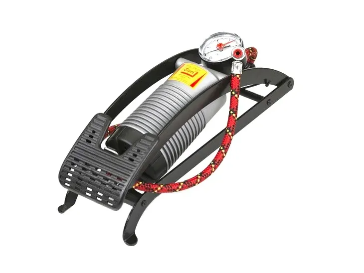 Pompka nożna z precyzyjnym manometrem zgodnym z normą EN 837-1, w klasie dokładności 1,6 o zakresie pomiarowym 0-6 bar, z podziałką 0,1 bar. Długość węża 700 mm.