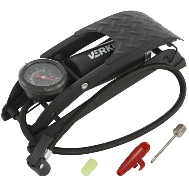Pompka nożna jednotłokowa VERKE. Pompka o solidnej konstrukcji, wykonana z tłoczonej, lakierowanej blachy stalowej o grubości 3 mm. Pedał w całości pokryty gumą dla lepszej przyczepności. Czytelny manometr pokazujący w barach (0-7) oraz PSI (0-100). Trwały i elastyczny wąż. W zestawie dwa adaptery. Idealna dla profesjonalnych serwisów jak i gospodarstw domowych.