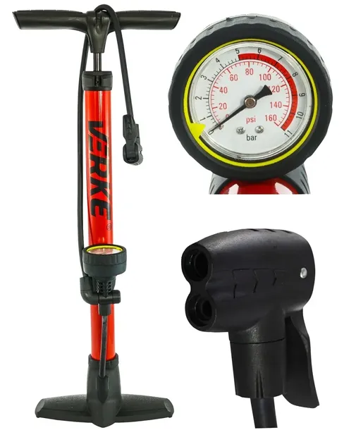 Pompka ręczna słupkowa VERKE. Duża, mocna i trwała pompka słupkowa z uniwersalnym, podwójnym zaciskiem na wentyle. Szeroka podstawa, i wysoki tłok umożliwiają szybko i komfortowe pompowanie opon. Adapter pasuje do kół od roweru, samochodu itp. Czytelny manometr pokazujący w barach (0-11) oraz PSI (0-160). Trwały i elastyczny wąż. Idealna dla profesjonalnych serwisów jak i gospodarstw domowych.