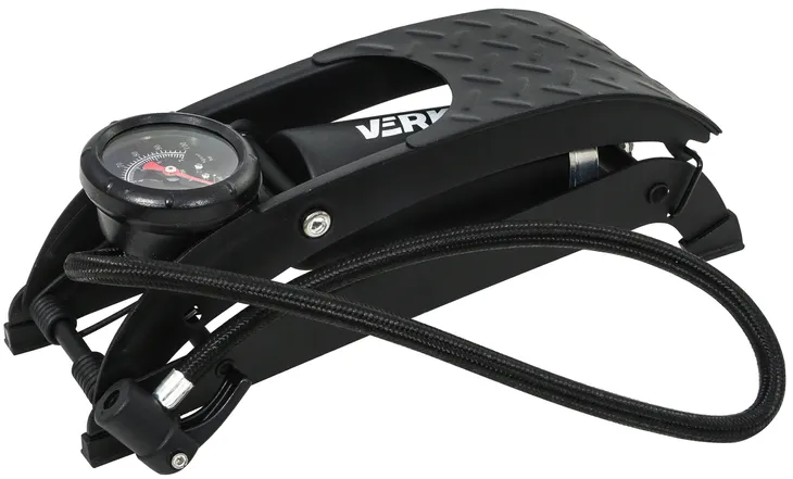 Pompka nożna jednotłokowa VERKE. Pompka o solidnej konstrukcji, wykonana z tłoczonej, lakierowanej blachy stalowej o grubości 3 mm. Pedał w całości pokryty gumą dla lepszej przyczepności. Trwały i elastyczny wąż. W zestawie dwa adaptery. Idealna dla profesjonalnych serwisów jak i gospodarstw domowych.