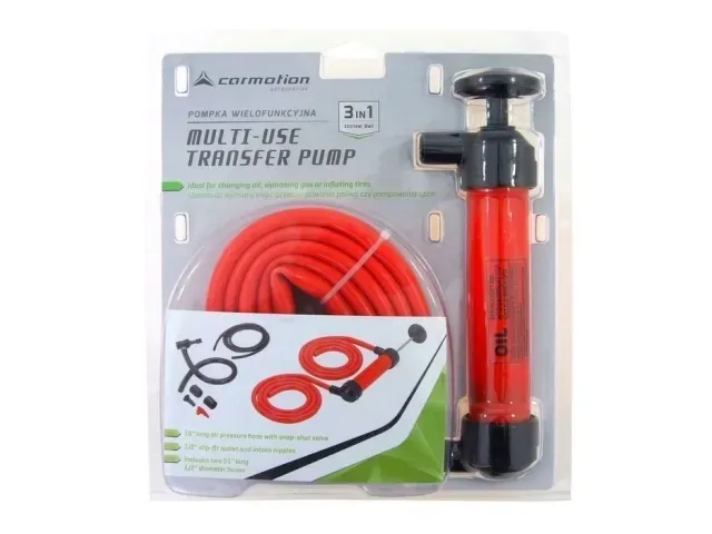 Pompka do płynów i powietrza 3 w 1 Pompka idealnie nadaje się do: 1. Przepompowywania paliwa 2. Pompowania np. roweru, piłki, materaca itp. 3. Wypompowywania wody np. łodzi 4.Tankowania pojazdu. W zestwie grube przewody (pomarańczowe) długości około 131 cm o średnicy około 15 mm Wiadro 12 litrów przepompować można w około 2,5 minuty !!! Przepompowanie cieczy ze zbiorników położonych wyżej niż zbiornik, do którego pompujemy np. wodę jest banalnie proste i łatwe. Wystarczy popompować kilka razy a ciecz poleci już sama.