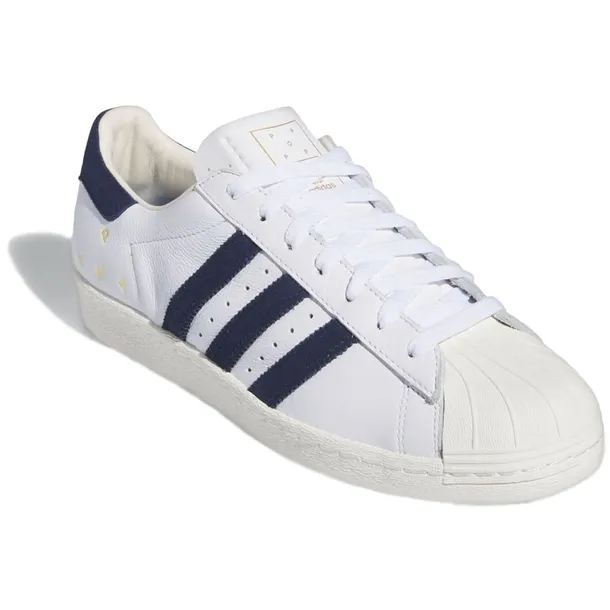 Po sukcesie debiutanckiej kolekcji, Pop przygotował kolejną dopracowaną historię i zestaw produktów. Nowa odsłona to odejście od technicznego stylu outdoorowego na rzecz estetyki głęboko zakorzenionej w historii marki adidas. Projekt ten jest efektem prawdziwej współpracy – widoczne są w nim liczne detale charakterystyczne dla obu marek. Model Pop Superstar ADV to połączenie najwyższej jakości wykończeń z kultowymi butami adidas Superstar. Złote akcenty i minimalistyczne logo nadają klasycznemu modelowi nowy wymiar. Pop Superstar ADV posiada zdekonstruowaną skórzaną cholewkę z zamszowymi trzema paskami, język inspirowany stylem vintage oraz logo Pop. Ten model łączy styl retro z elastyczną podeszwą typu cupsole, tworząc sylwetkę idealną do jazdy na deskorolce.