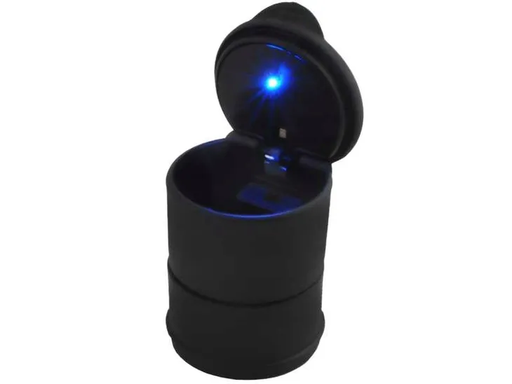 Popielniczka na odpadki z niebieskim podświetleniem, zasilana baterią CR1220 (w zestawie). Doskonała nie tylko do samochodu (w miejscu na kubek lub do uchwytu), ale także do biura, na balkon itp.
