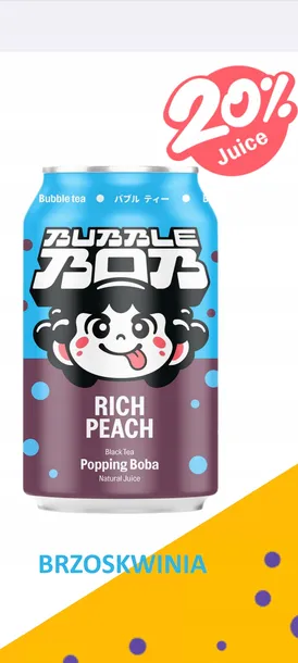 Bubble Bob Rich Peach o smaku brzoskwiniowym to napój, który łączy delikatność brzoskwini z dynamiczną świeżością. Jego unikalny skład – 61% herbaty, 20% soku brzoskwiniowego i 12% pękających kuleczek – sprawia, że każdy łyk to prawdziwa przyjemność. Stworzony dla młodych, nowoczesnych konsumentów, Bubble Bob to rewolucja w świecie napojów – smak, zabawa i orzeźwienie w jednym. SKŁADNIKI: Czarna herbata parzona na gorąco (woda, czarna herbata), (60,76%), sok brzoskwiniowy (20%), pękające kuleczki popping boba (woda, cukier, substancja żelująca, alginian sodu, regulatory kwasowości: kwas cytrynowy, kwas jabłkowy, substancja zagęszczająca: guma ksantanowa, substancja wiążąca: mleczan wapnia, aromat) (12%), cukier, regulator kwasowości: kwas cytrynowy, przeciwutleniacz: kwas askorbinowy, stabilizator: guma gellan, aromaty.
