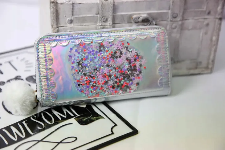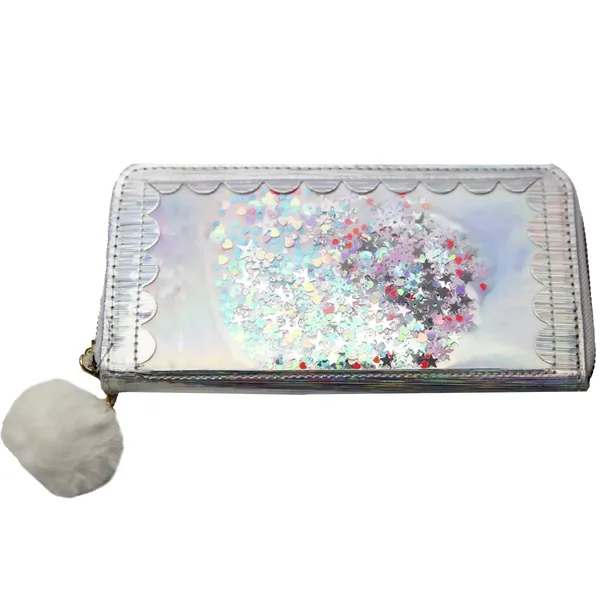 Piękny srebrny portfel, który zaskakująco mieni w zależności od padania światła. Z przodu portfela pod przezroczystym frontem ukryte jest mnóstwo kolorowych drobinek w różnych kształtach: gwiazdek, serduszek, śnieżynek. Dodatkowo pod drobinkami jest warstwa materiału holo który imituje lusterko oraz również pięknie się mieni. Do suwaka doczepiony biały puszysty pomponik.