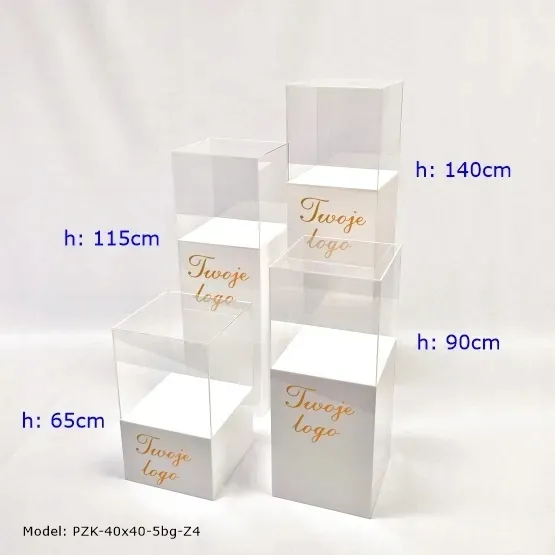 Podesty z kloszami, postumenty z plexi mlecznej 40x40cm, trzy wysokości, wersja STANDARD z plexi 5mm - 4 szt + LOGO