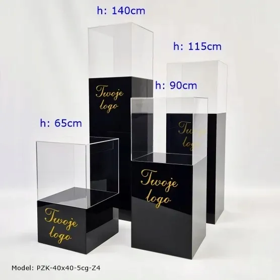 Podesty z kloszami, postumenty z plexi czarnej 40x40cm, trzy wysokości, wersja STANDARD z plexi 5mm - 4 szt + LOGO.