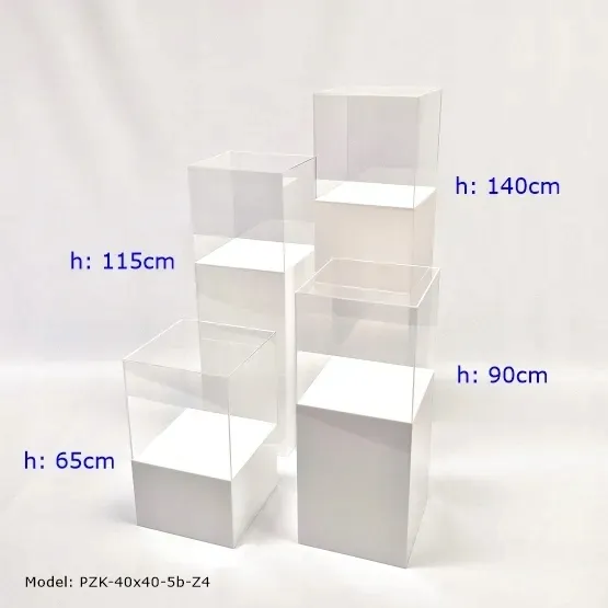 Podesty z kloszami, postumenty z plexi mlecznej 40x40cm, trzy wysokości, wersja STANDARD z plexi 5mm - 4 szt.