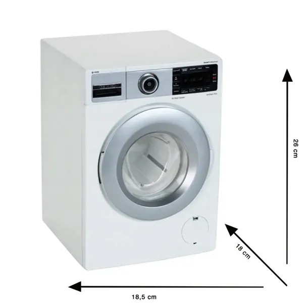 Zabawkowa pralka na baterie z funkcjami odpowiednimi dla dzieci jest wierna oryginalnej replice z wyświetlaczem zaprojektowanym przez firmę Bosch. Ma możliwość napełniania i odprowadzania wody, działa z wodą i bez wody oraz ma cztery różne oryginalne dźwięki, które pasują do programów.