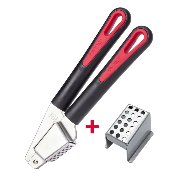 Prasa do czosnku »Gallant Plus« z 2 wkładkami prasującymi • prasuje niezawodnie bez większego wysiłku • z 2 wyjmowanymi wkładkami prasującymi do łatwego czyszczenia • części funkcjonalne ze stali nierdzewnej • tłok prasujący z poliamidu.