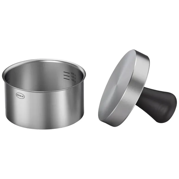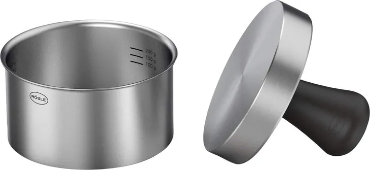 Materiał: Wykonana ze stali nierdzewnej 18/10, co gwarantuje trwałość i odporność na korozję. Dodatkowo, użyto TPE (termoplastycznego elastomeru) dla zwiększenia komfortu użytkowania. Skład: Zestaw składa się ze stempla i pierścienia. Średnica pierścienia: 11 cm/4,3 cala, pasuje do standardowych i dużych bułek burgerowych. Wysokość pierścienia: 6 cm, z podziałką umożliwiającą formowanie kotletów od 100 g do 350 g. Funkcjonalność: Ułatwia formowanie i wyjmowanie burgerów, idealna do prostego i łatwego przygotowywania hamburgerów. Zastosowanie: Nie jest zaprojektowana do użytku na grillu. Czyszczenie: Można myć w zmywarce, co ułatwia utrzymanie czystości. Przygotowanie: Idealna do porcjowania i ważenia mielonego mięsa, umożliwia formowanie kul mięsnych i ich przekształcanie w kotlety burgerowe. Wymiary i waga produktu: Waga: 0,43 kg Wymiary (wysokość x szerokość x długość): 70 mm x 130 mm x 160 mm Wymiary bez opakowania: 9 cm x 12 cm x 12 cm Waga bez opakowania: 0,37 kg Kolor: Czarny Powierzchnie: Matowe i szorstkie Bezpieczeństwo użytkowania: Bezpieczna w kontakcie z żywnością. Odporność na temperaturę: Do 100°C. Średnica części funkcjonalnej: 11 cm Długość użytkowa: 5 cm Średnica rączki: 0,4 cm Pojemność napełniania: 0,3 l „Prasa do burgerów PRO” to doskonały wybór dla osób, które chcą przygotowywać idealnie uformowane hamburgery w domowych warunkach. Łatwa w obsłudze i czyszczeniu, sprawia, że przygotowanie burgerów staje się szybkie i przyjemne.