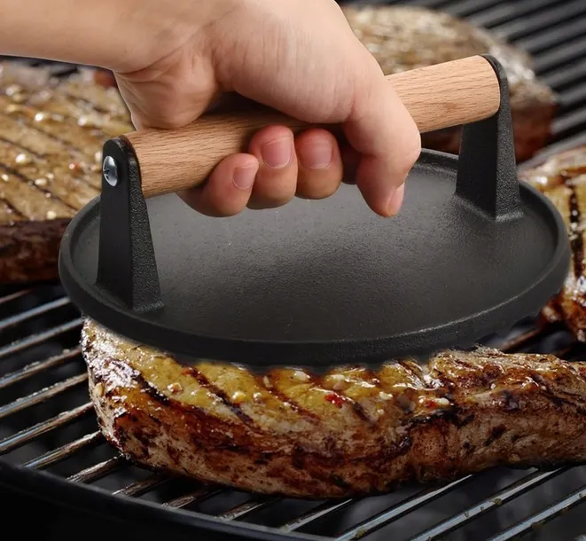 Nieprzywierająca prasa do burgerów z żeliwa z drewnianym uchwytem