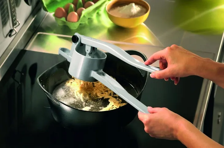 Praskę spaetzle GEFU znajdziesz obok maszynki do makaronu, praski do hamburgerów i wszystkich produktów, które nadają warzywom i owocom wyjątkowy kształt.