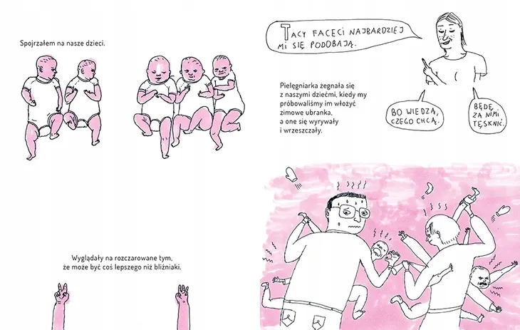 Macierzyństwo, tacierzyństwo – nawet jeśli przeżywamy te stany nie pierwszy raz – to zawsze wyprawa w nieznane. Bo narodziny malucha (czasem dwójki jednocześnie!) mogą być jak trzęsienie Ziemi, po którym zastajemy zupełnie nowy układ sił. Małe istoty znienacka zaczynają nas porażać mądrością, sprytem i wyobraźnią. A ta rozwija skrzydła tak szeroko, że świat i literatura schodzą się w jedno, prawda i fikcja są już nie do odróżnienia. Bohaterami tej przezabawnej, nieco magicznej, ale przede wszystkim pełnej czułości historii są bracia bliźniacy, którzy jak tylko wyskakują z brzucha mamy, przebojem wkraczają w świat, nie szczędząc przy tym nieco pogubionych dorosłych. „Ta książka to prezent dla moich synów: Romana i Emila. A tak naprawdę to oni są największym prezentem, jaki Julia i ja dostaliśmy od życia” – Mikołaj Łoziński. – Jak to było, kiedy się urodziłam? – zapytała moja córka. Zamyślony patrzyłem na czarną kreskę na środku twarzy rysowanego noworodka i przypomniałem sobie moment, kiedy zobaczyłem ją po raz pierwszy (po tym, jak z cichym chlupnięciem pojawiła się na świecie), kiedy wydała z siebie pierwszy krzyk, kiedy po raz pierwszy wziąłem ją na ręce (choć dziś podnieść ją to niełatwe zadanie). Ile razy jeszcze przyjdzie o coś mnie zapytać? Zmiąłem pomazaną kartkę i wyrzuciłem do kosza. Posadziłem ją na kolanach i zacząłem opowieść: – Mama wyszyła spod prysznica i powiedziała: „To chyba już... – Janek Koza.