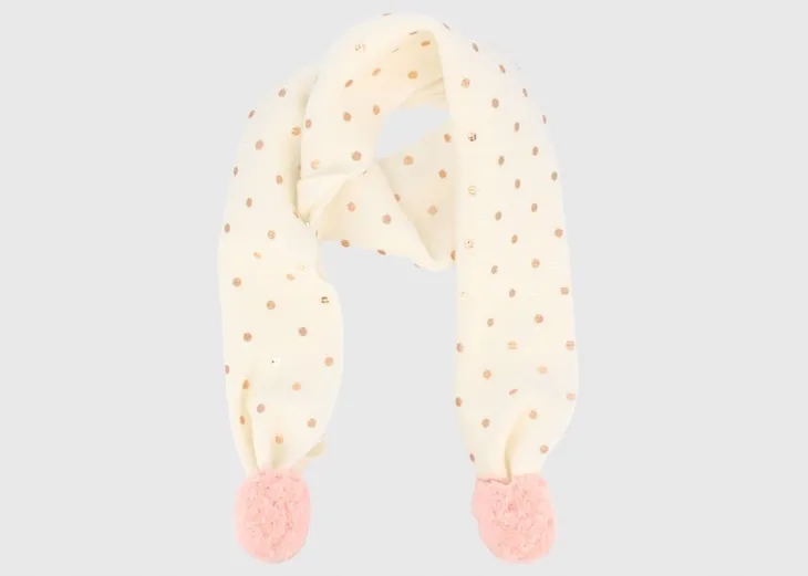Szal dziecięcy marki Primgi model 54324541 w kolorze kremowym. Szal z miękkiej dzianiny w kropki z pomponami. Ten szal zapewni zarówno ciepło w chłodne dni, jak i stylowy wygląd.