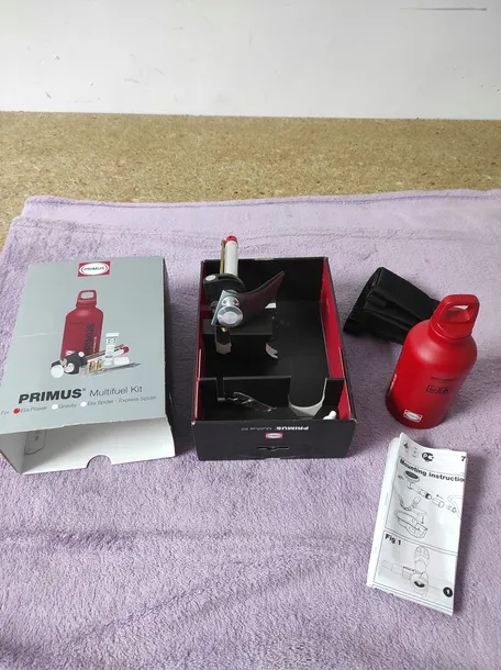 - W skład zestawu wchodzą: butelka na paliwo płynne 0,6l, pompka do paliwa Ergo Pump, Multitool z igłą do czyszczenia, różne rodzaje dysz stosowane w zależności od używanego paliwa, pokrowiec do przechowywania zestawu;