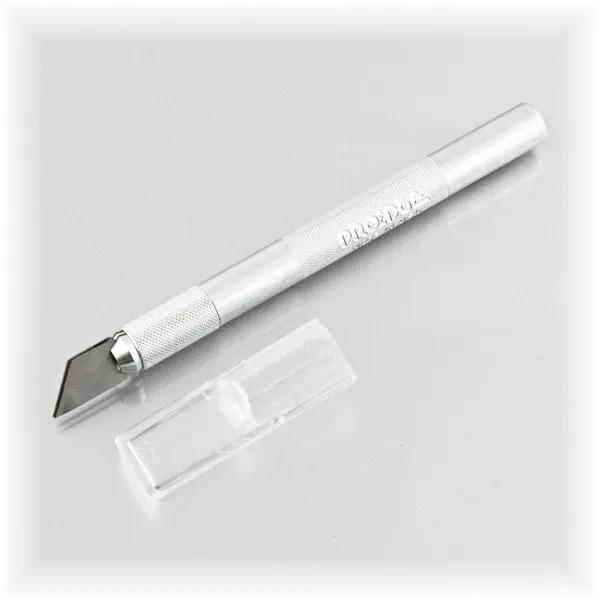 Nóż do szkła z podwójnym ostrzem w komplecie z plastkikową nakładką zabezpieczającą ostrze.