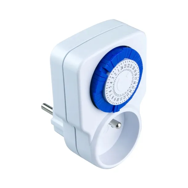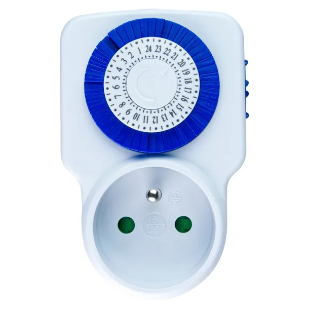 Programator czasowy 24 h analogowy. Gniazdo z uziemieniem 2P+Z. Max. Obciążenie: 16 A (3500 W). Dokładność ustawiania czasu: 30 min. Stopień ochrony: IP20. Kolor: biały. Opakowanie: blister