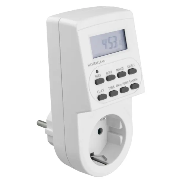 Programator czasowy cyfrowy. Gniazdo Schuko. Max. Obciążenie: 16 A (3680 W). Dokładność ustawiania czasu: 1 min. Stopień ochrony: IP20. Kolor: biały. Opakowanie: blister