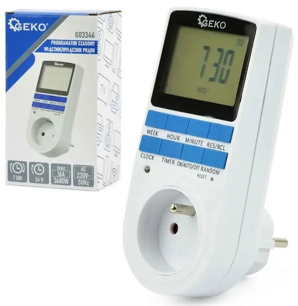 Programator czasowy przeznaczony do sterowania urządzeniami zasilanymi z sieci 230V. Urządzenie pozwala w łatwy sposób zaplanować dzień/dni oraz godzinę włączenie i wyłączenie podłączonego urządzenia. Stosowanie programatora czasowego pomaga zaoszczędzić energię energetyczną, a co za tym idzie zmniejszyć rachunki za prąd.