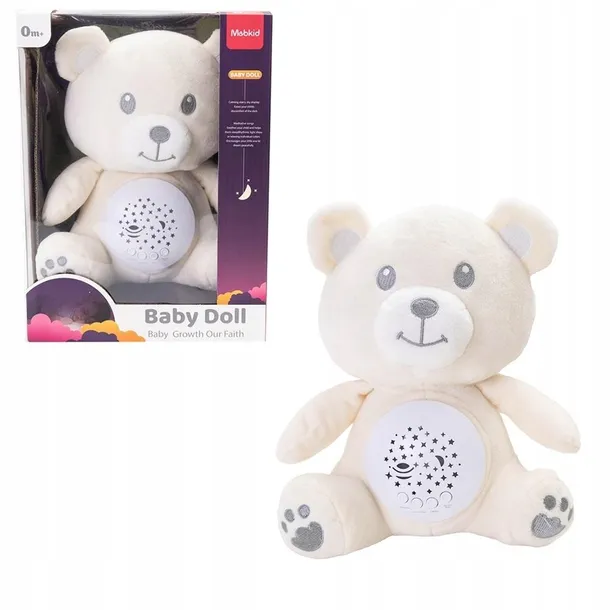 Projektor lampka - miś. Delikatne dźwięki muzyki. Kolorowy projektor, który wyświetla gwiazdki na ścianach lub suficie. Mechanizm można wyjąć i wyprać pluszaka. Wymiary opakowania: 26 x 19 x 14 cm.