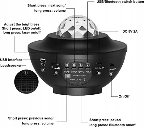 - Za pomocą pilota można łatwo kontrolować jasność projektora, wielkość dźwięku muzyki, prędkość itp. oraz łatwo zmieniać żądany tryb. Możesz także wybrać ulubioną muzykę przez interfejs Bluetooth lub USB, aby zanurzyć się w romantycznych, relaksujących i wygodnych utworach. Oczywiście możesz także ustawić przyciski na projektorze starlight