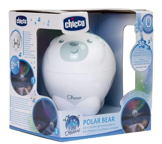 PROJEKTOR MIŚ POLARNY o kształcie uroczego misia łączy funkcję projektora, który z łatwością możemy zamontować na łóżeczku niemowlęcym oraz projektora do postawienia np. na szafce nocnej.