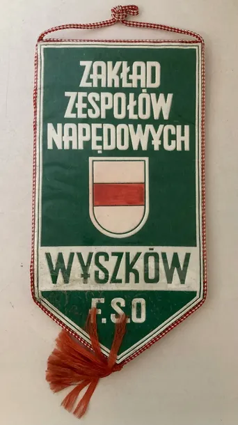 Stan: rozdarcie między szwami w dolnej części proporczyka, folia ochronna rozdarta, brak także jej kawałka, widoczne przykurzenia, frędzelek postrzępiony
