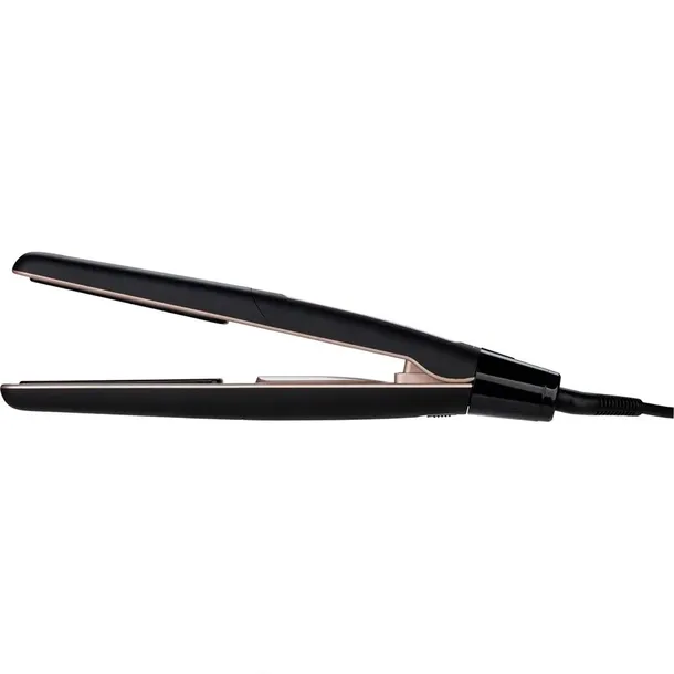 Szybkie nagrzewanie – gotowy do użycia w ciągu zaledwie 12 sekund. Wskazówka dotycząca gotowości do pracy dzięki sygnałowi akustycznemu. Zaokrąglona obudowa – idealne rozwiązanie do pięknych loków i fal. Indywidualna regulacja temperatury w zakresie 120°C – 220°C. Płyty grzewcze pokryte ceramiką, funkcja jonizacji zapewnia gładkie i błyszczące włosy, w zestawie odporna na wysokie temperatury torba do przechowywania