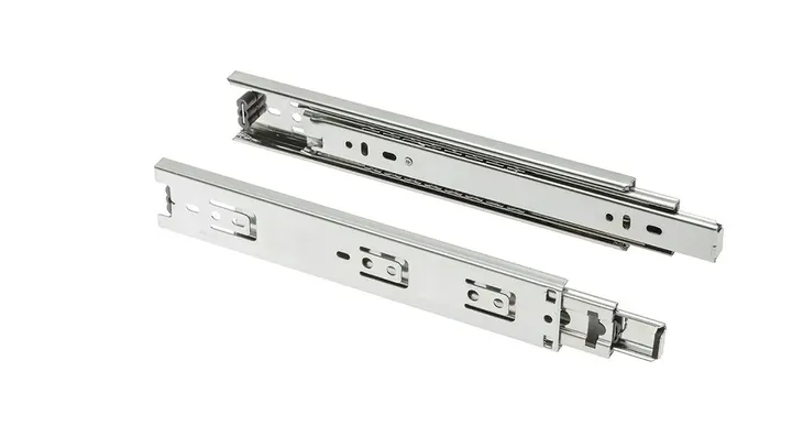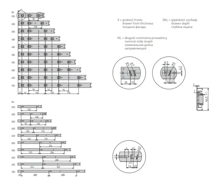 Całość wykonana jest ze stali co zapewnia maksymalne obciążenie na poziomie 30kg. Gumowa blokada w pozycji zamkniętej zapobiega samoczynnemu otwarciu. Prowadnica posiada pełen wysuw.