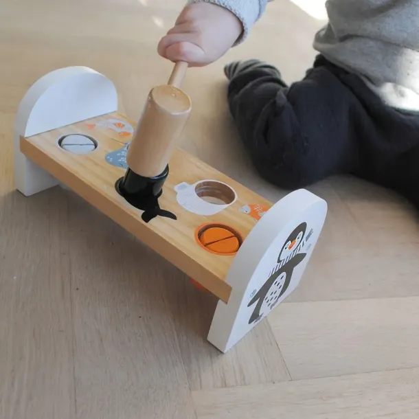 Przebijanka z pingwinkiem to produkt gwarantujący wiele godzin niezapomnianej zabawy. Po uderzeniu drewnianym młoteczkiem w dany klocek, ten przebija się na druga strone. Zabawka wykonana jest z drewna w ślicznej kolorysyce. Całość zapakowana w śliczne opakowanie.