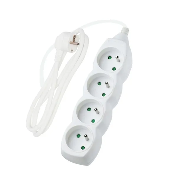 Przedłużacz elektryczny w kolorze białym, wyposażony w cztery gniazda z uziemieniem, to idealny wybór do domu i biura. Oferuje bezpieczne podłączenie wielu urządzeń elektrycznych w jednym miejscu.