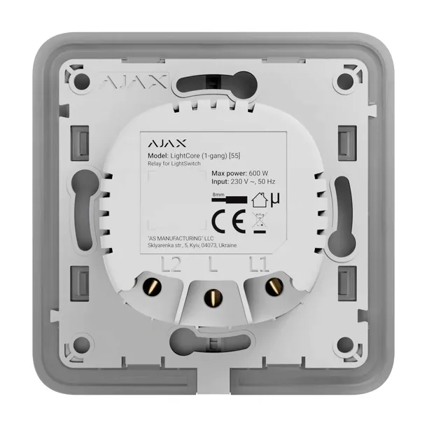 Ajax LightCore (1-gang) to przekaźnik przeznaczony do inteligentnego przełącznika jednogniazdowego. Zasilany napięciem 230 V, jest w stanie obsłużyć maksymalnie 600 W. Wyposażony w zabezpieczenia termiczne (powyżej 60°C) oraz prądowe (powyżej 2,6 A). Cechuje się niskim poborem prądu wynoszącym maksymalnie 200 mW.