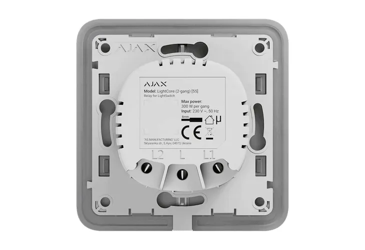 Ajax LightCore (2-gang) to przekaźnik przeznaczony do inteligentnego przełącznika dwugniazdowego. Zasilany napięciem 230 V, jest w stanie obsłużyć maksymalnie 300 W na jeden segment. Wyposażony w zabezpieczenia termiczne (powyżej 60°C) oraz prądowe (powyżej 2,6 A). Cechuje się niskim poborem prądu wynoszącym maksymalnie 200 mW.