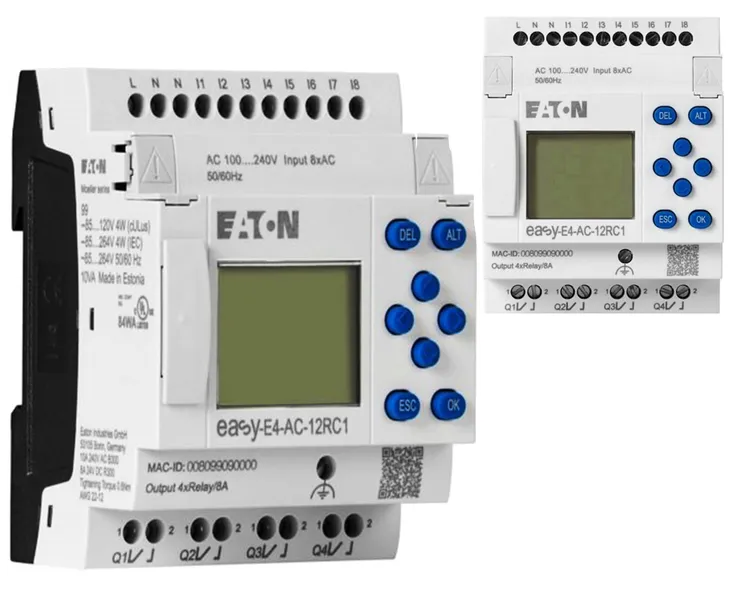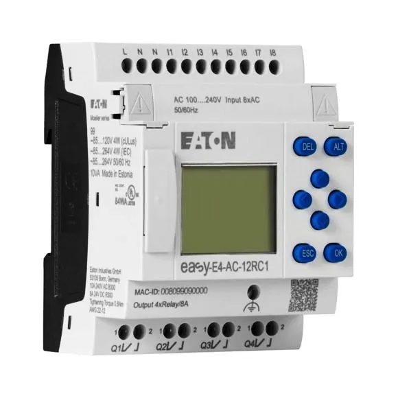 EASY-E4-AC-12RC1 to model jednostki sterującej z serii EASY-E4 firmy Eaton. EASY-E4 jest serią zaawansowanych jednostek sterujących programowalnych (PLC) wykorzystywanych w systemach automatyki i sterowania.