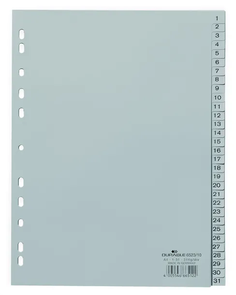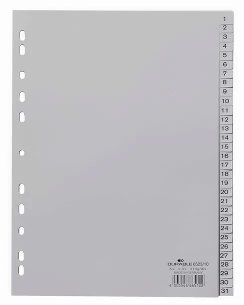 Przekładki służą do sortowania dokumentów w segregatorach. Wykonane są z polipropylenu. Posiadają zadrukowane, numeryczne indeksy- z podziałem 1-31 oraz uniwersalną perforację. Cały komplet składa się z 31 szarych przekładek o wymiarach 297 x 230 mm (wys. x szer.). Durable jest jednym z wiodących niemieckich producentów markowych produktów do prezentacji oraz organizacji środowiska biurowego. Przyjazny dla środowiska zgodnie z ISO 14021 (w 100 % nadający się do recyklingu).