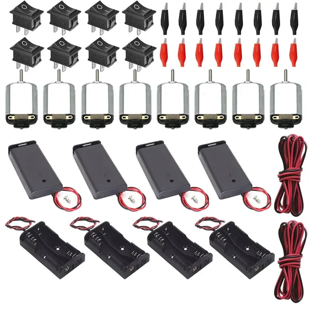 Kompletny zestaw do nauki elektroniki i majsterkowania dla dzieci i młodzieży. Idealny do tworzenia własnych projektów, takich jak miniaturowe samochody, łodzie, wentylatory czy inne modele zasilane elektrycznie.