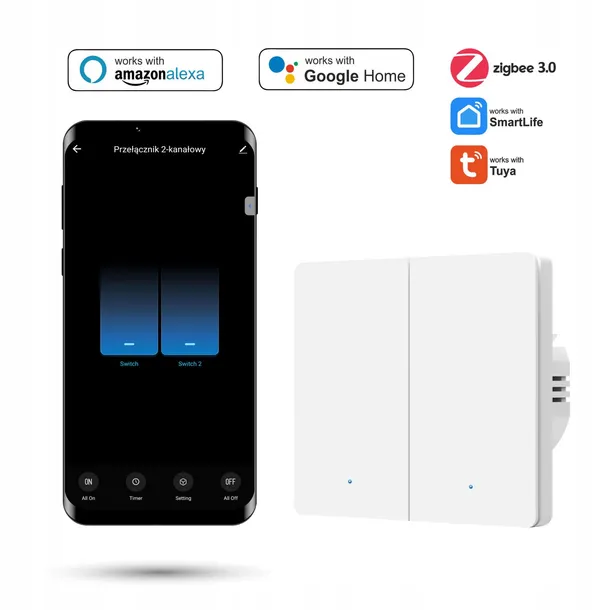 Przełącznik ścienny Zigbee Tuya 2-kanałowy Biały współpracuje z darmowymi aplikacjami Tuya lub SmartLife które wykorzystywane są również do sterowania najważniejszymi urządzeniami w aplikacjach Smart Home, m.in. gniazdkami, oświetleniem, monitoringiem, klimatyzacją, ogrzewaniem czy nawadnianiem ogrodów. Dzięki temu Twój inteligentny dom możesz kontrolować korzystając z jednej aplikacji.