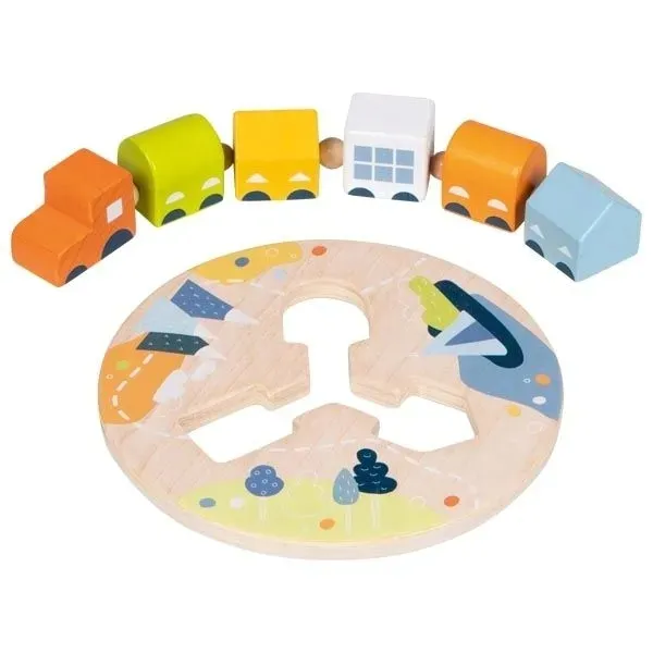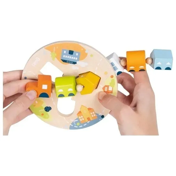 Wagoniki mają trzy różne kształty tak, że każdy pasuje do jednego z otworów na kole. Zabawa polega na trafianiu wagonikiem do odpowiedniego otworu, a następnie przełożenie pociągu do kolejnego otworu, bo każdy wagonik już jest w innym kształcie.