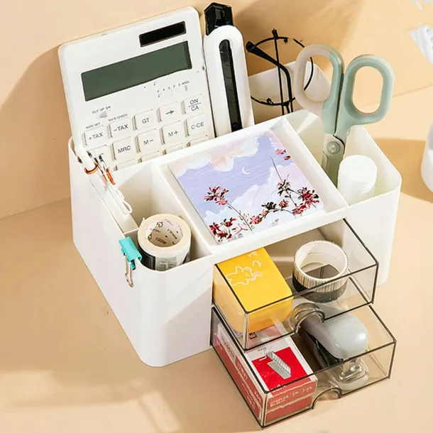 Pojemność tego organizera na biurko jest zwiększona, jest wyposażony w 5 przegródek i 2 przezroczyste szuflady, podział organizera zapewnia czystsze biurko, a przezroczyste szuflady umożliwiają łatwiejsze przenoszenie przedmiotów, dodając miejsce do przechowywania większej liczby przedmiotów czysty pulpit.