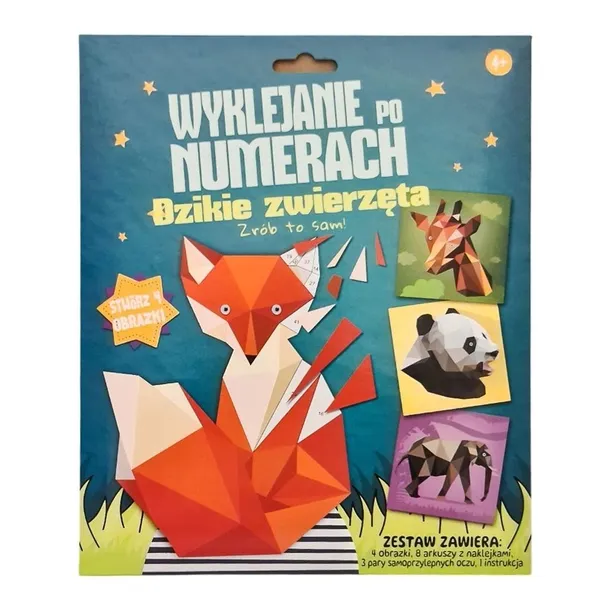 Wymiar pojedynczego obrazka: 20x20cm. W zestawie: 4 plansze do wyklejania z numerkami, arkusze z kolorowymi naklejkami, instrukcja, ruchome oczka. W wyniku wyklejania powstają 4 obrazki w stylu origami. Wyklejanie obrazków ułatwią numerki - opisane w instrukcji i odpowiadające im na polach ilustracji. Zabawa naklejkami rozwija wyobraźnię, zdolności manualne oraz motorykę i koncentrację . Pomaga w nauce rozpoznawania liczb. Odpręża i relaksuje.