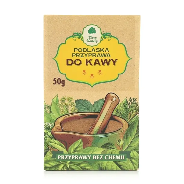 DARY NATURY PODLASKA PRZYPRAWA DO KAWY 50G Kawa z dodatkiem tej przyprawy doskonale zyskuje na aromacie i smaku. Przyprawa wzmacnia także działanie pobudzające kawy, dzięki czemu można ją robić słabszą, działa wzmacniająco i rozgrzewająco. Sposób użycia: na jedną filiżankę kawy stosuje się szczyptę przyprawy. Można stosować do kawy z ekspresu. Najlepszy efekt uzyskuje się gotując kawę ok 1-2 min. razem z przyprawą. Skład (w różnych proporcjach): kardamon, cynamon, goździki, imbir, kuklik kłącze. Opakowanie: 50g